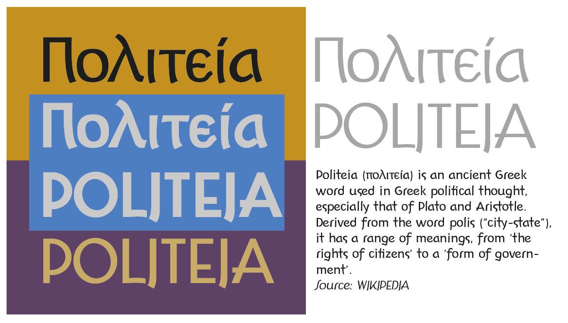 The word “Politeia” has its roots in ancient Greek and is derived from the word “Polis” (“city-state”). Used by Plato and Aristotle with various meanings such as “the rights of citizens” or “the form of government of a place”.